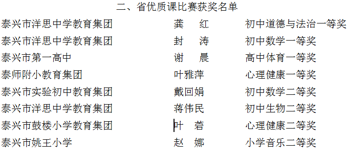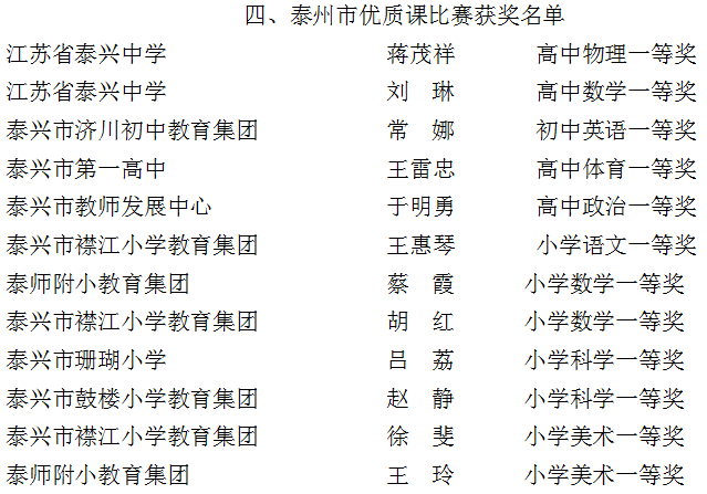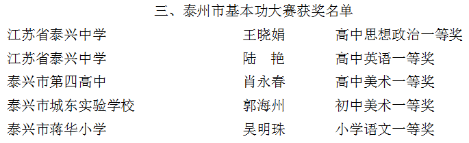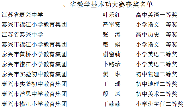 2019年,我市紧紧围绕打造“现代化、高质量、有品位的泰兴教育”总目标,聚焦课堂改革,充分发掘和丰富洋思“先学后教、当堂训练”课堂教学新内涵,不断提高课堂教学的针对性和实效性;聚力专业提升,大力实施全员全科培训,加大骨干教师培养力度,积极组织优秀教师参加省、市优质课、基本功大赛,取得了获奖层次和位次的新突破。现将2019年我市中小学教师在省、市基本功和优质课比赛中获奖情况公布如下: