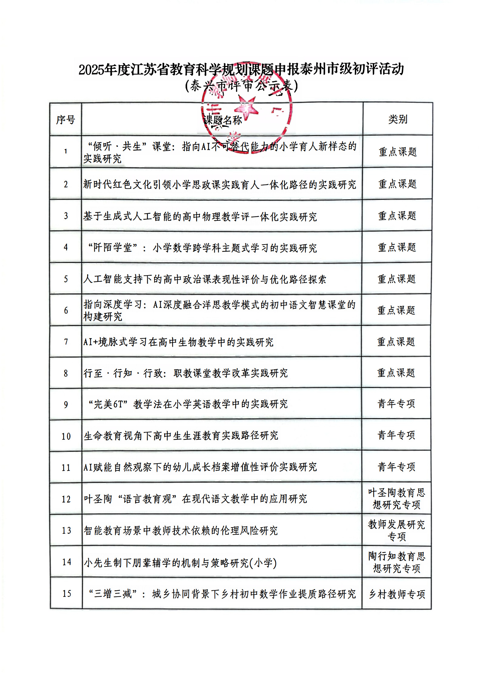 2025年度江苏省教育科学规划课题申报泰州市级初评活动泰兴市评审公示表